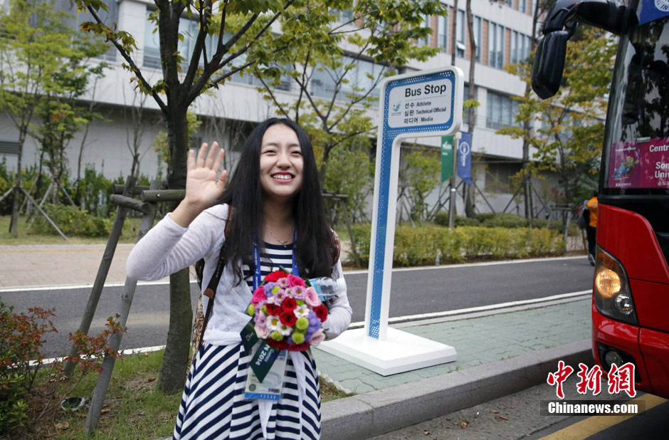Zhou Qi waves goodbye after a day's work in Incheon, Sept. 28, 2014. (Chinanews.com/Tang Yanjun)