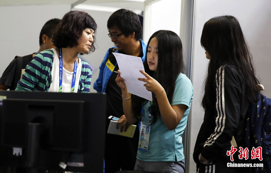 Zhou Qi provides service for Chinese journalists in Incheon, Sept. 28, 2014. (Chinanews.com/Tang Yanjun)