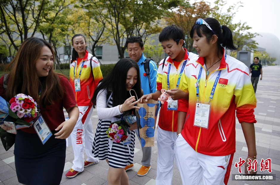 Zhou Qi looks at the gifts in a Chinese athlete's bag in Incheon, Sept. 28, 2014. (Chinanews.com/Tang Yanjun)