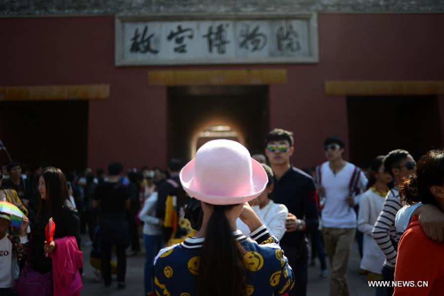 | A tourist poses for photo outside the northern gate of the Palace Museum on the second day of the Chinese National Day holidays in Beijing, capital of China, Oct. 2, 2014. Almost all scenic spots in Beijing were packed with tourists on the second day of the National Day holidays, which falls from Oct. 1 to Oct. 7. The 26 mainly monitored scenic spots of Beijing received 542,000 trips on Oct. 1, up 32.8 percent over the same day of last year. (Xinhua/Jin Liangkuai) |