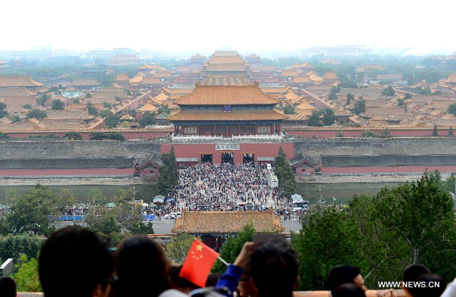 The northern gate of the Palace Museum is crammed with tourists on the second day of the Chinese National Day holidays in Beijing, capital of China, Oct. 2, 2014. Almost all scenic spots in Beijing were packed with tourists on the second day of the National Day holidays, which falls from Oct. 1 to Oct. 7. The 26 mainly monitored scenic spots of Beijing received 542,000 trips on Oct. 1, up 32.8 percent over the same day of last year. (Xinhua/Jin Liangkuai)