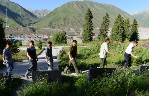 | Chen and other retirees pour liquor on the tombs of fallen soldiers in the Tianshan Mountains right before Army's Day on Aug 1. Photo by HENG GUOLIANG |
