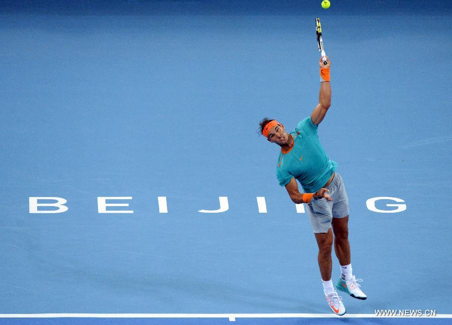 Rafael Nadal of Spain serves the ball during the men's singles quarterfinal match against Martin Klizan of Slovakia at the China Open tennis tournament in Beijing, China, Oct. 3, 2014. Nadal lost 1-2. (Xinhua/Chen Yehua)