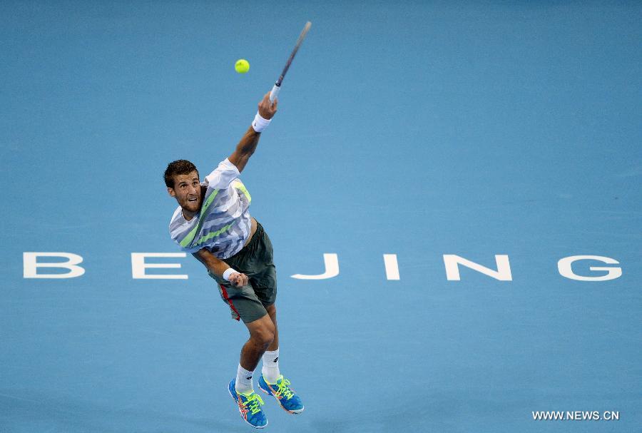 Martin Klizan of Slovakia serves the ball during the men's singles quarterfinal match against Rafael Nadal of Spain at the China Open tennis tournament in Beijing, China, Oct. 3, 2014. Klizan won 2-1. (Xinhua/Chen Yehua)
