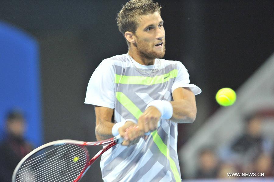 | Martin Klizan of Slovakia returns the ball during the men's singles quarterfinal match against Rafael Nadal of Spain at the China Open tennis tournament in Beijing, China, Oct. 3, 2014. Klizan won 2-1. (Xinhua/Li Wen) |