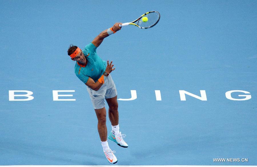 Rafael Nadal of Spain serves the ball during the men's singles quarterfinal match against Martin Klizan of Slovakia at the China Open tennis tournament in Beijing, China, Oct. 3, 2014. Nadal lost 1-2. (Xinhua/Chen Yehua)