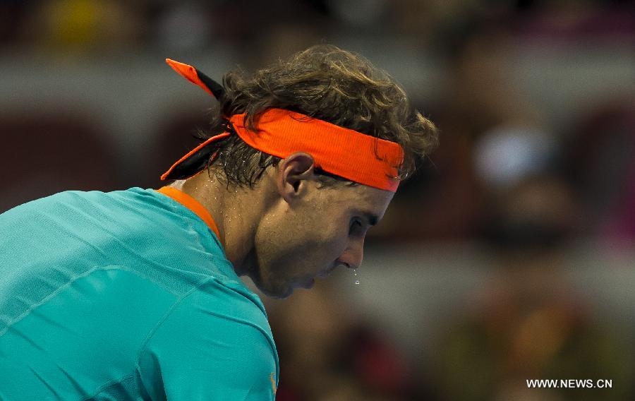 Rafael Nadal of Spain reacts during the men's singles quarterfinal match against Martin Klizan of Slovakia at the China Open tennis tournament in Beijing, China, Oct. 3, 2014. Nadal lost 1-2. (Xinhua/Zhang Yu)