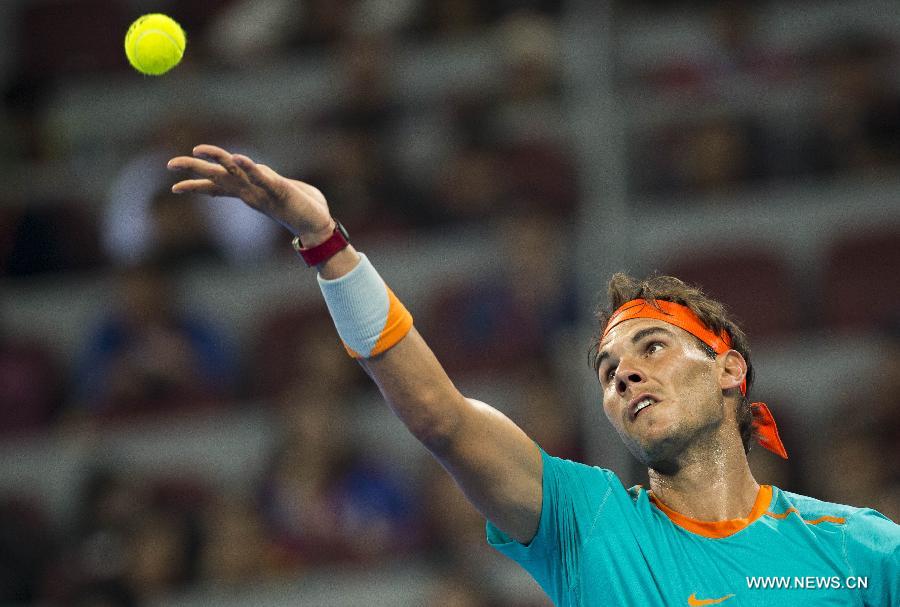 Rafael Nadal of Spain serves the ball during the men's singles quarterfinal match against Martin Klizan of Slovakia at the China Open tennis tournament in Beijing, China, Oct. 3, 2014. Nadal lost 1-2. (Xinhua/Zhang Yu)