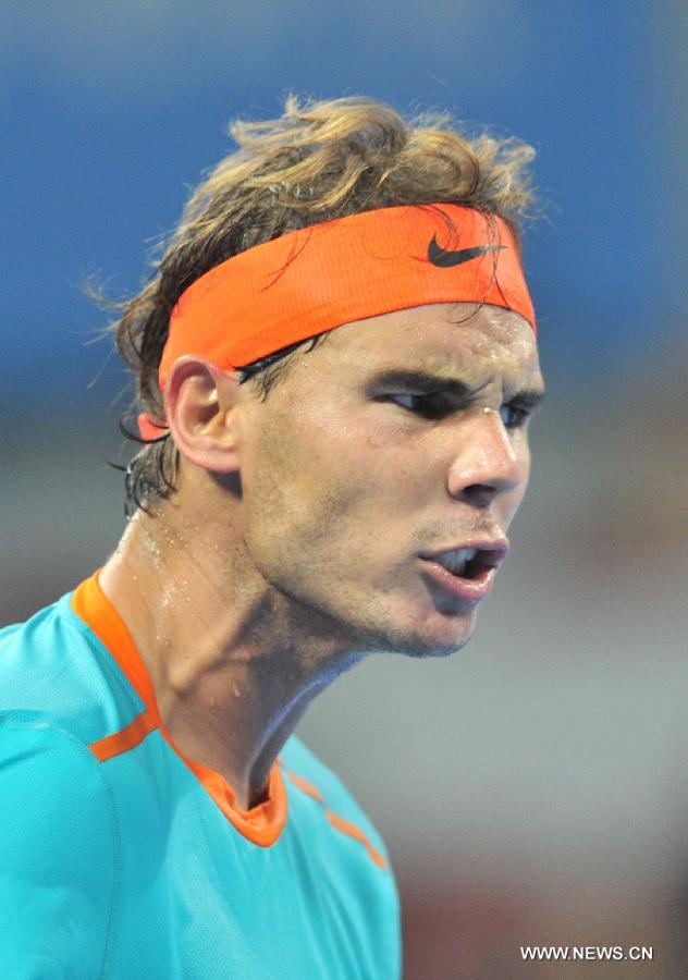 Rafael Nadal of Spain reacts during the men's singles quarterfinal match against Martin Klizan of Slovakia at the China Open tennis tournament in Beijing, China, Oct. 3, 2014. Nadal lost 1-2. (Xinhua/Li Wen)