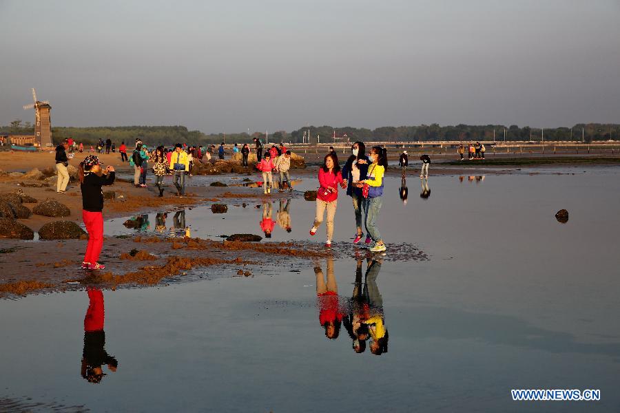 People enjoy themselves on the shoals in Qinhuangdao City, north China's Hebei Province, Oct. 4, 2014. Many people came to Qinhuangdao, a famous tourist city in north China, during the seven-day National Day holiday. (Xinhua/Yang Shiyao)