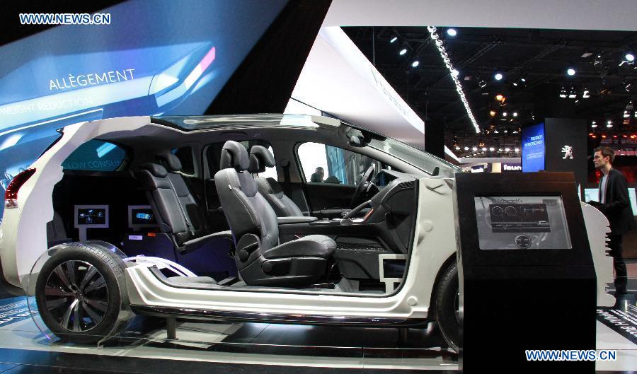A man looks at a car during the 2014 international car exhibition in Paris, France, on Oct.4, 2014. The 2014 international car exhibition opened its doors to the public on Oct. 4, inviting people to be the first to see new models and check out the latest innovative technology of more than 260 car manufacturers from 18 countries and regions. (Xinhua/Zheng Bin)