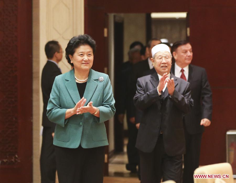 | Chinese Vice Premier Liu Yandong (L) greets delegates attending the reception held by the Islamic Association of China (IAC) to celebrate the Corban Festival, or Eid al-Adha, in Beijing, capital of China, Oct. 4, 2014. (Xinhua/Ding Lin) |