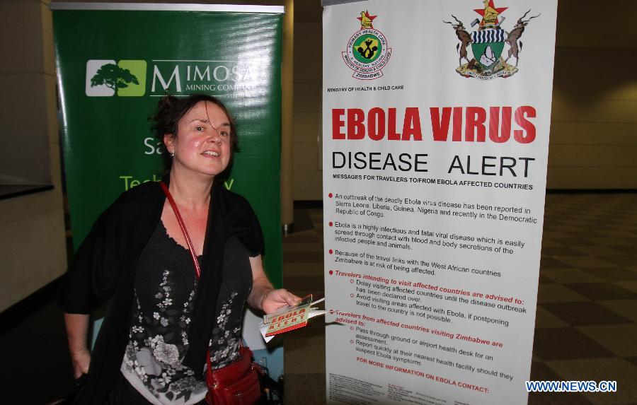 A passenger holds a pamphlet on ebola prevention as she arrives at Harare International Airport, Zimbabwe, Oct. 6, 2014. A Zimbabwean mining firm called Mimosa recently donated 100,000 U.S. dollars of scanners, television sets and cameras to the ministry of Health to help keep Ebola out of the country. Ebola has claimed nearly 3,000 lives in West Africa. Zimbabwe has so far not recorded any case of the fatal disease. (Xinhua)