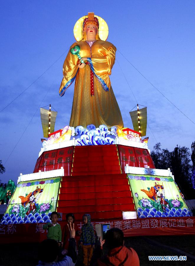 Kids pose for photos in front of a lantern during a lantern show in Beijing, capital of China, Oct. 6, 2014. The lantern show demonstrated folk customs and culture of southeast China's Taiwan. (Xinhua/Pan Xu)
