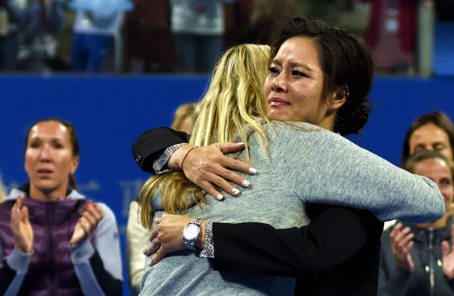 China's tennis great Li Na cries as she hugs two-time Wimbledon winner Petra Kvitova at her retirement ceremony during the China Open in Beijing on Sept. 30, 2014. (Li Zhenyu/People's Daily Online)