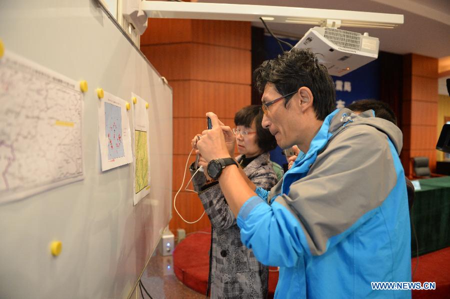 Two journalists take photos of the epicenter location map of Jinggu County earthquake at the Seismological Bureau of Yunnan Province in Kunming, capital of southwest China's Yunnan Province, Oct. 7, 2014. A 6.6-magnitude earthquake jolted Jinggu County of Pu'er City in Yunnan at 9:49 p.m. Beijing Time (1349 GMT), according to the China Earthquake Networks Center (CENC). (Xinhua/Hu Chao)