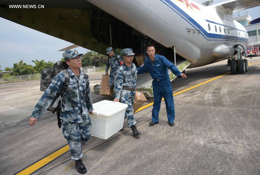 Soldiers carry medical supplies for quake-hit areas at the Simao Airport in southwest China's Yunnan Province, Oct. 8, 2014. Medical staff and supplies from Chengdu Air Force have arrived at the Jinggu County on Wednesday. A 6.6-magnitude quake jolted Yunnan Province Tuesday night. (Xinhua/Xue Yubin)