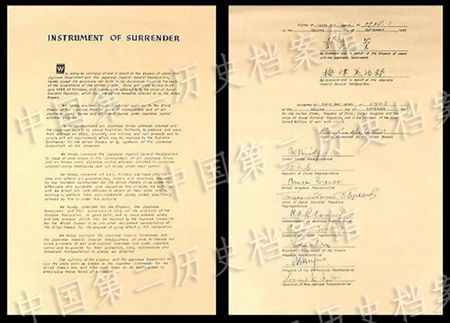 The instrument of surrender on Sept. 2, 1945. (Photo/Second Historical Archives of China)