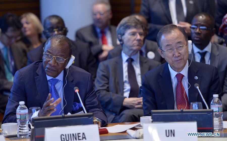 Alpha Conde, President of Guinea speaks at a meeting discussing the Ebola impact, possible solutions and how to support countries affected by the Ebola crisis, at the World Bank in Washington D.C., the United States, Oct. 9, 2014. (Xinhua/Yin Bogu)
