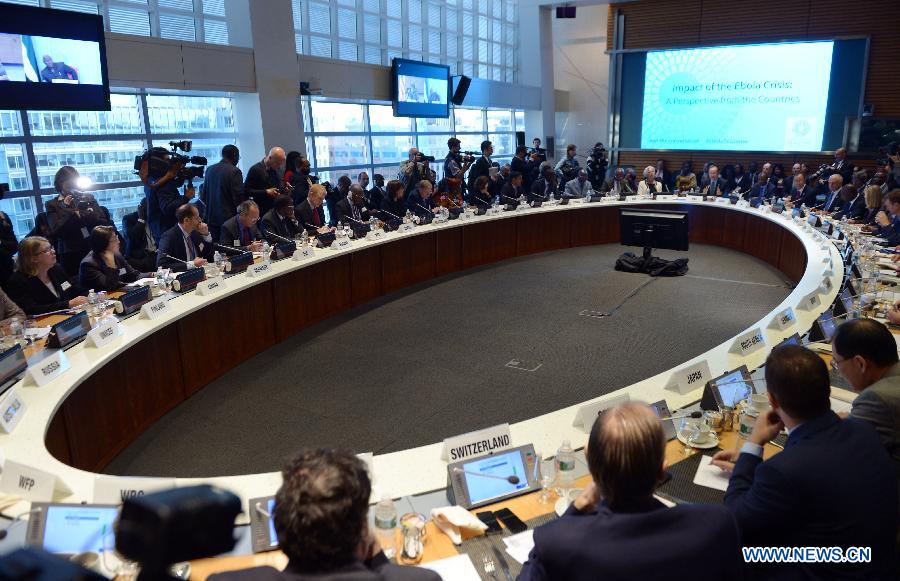 Delegates attend a meeting discussing the Ebola impact, possible solutions and how to support countries affected by the Ebola crisis, at the World Bank in Washington D.C., the United States, Oct. 9, 2014. (Xinhua/Yin Bogu)
