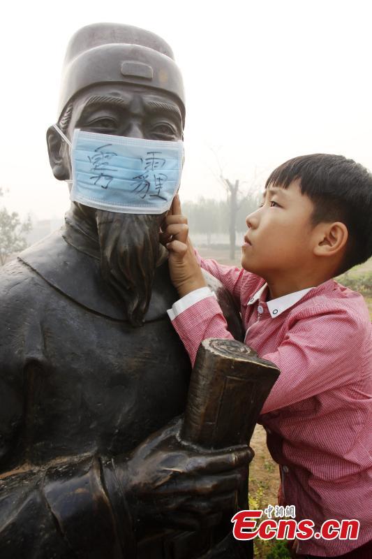 A child puts mask on a sculpture to ‘protect’ it from smog during an environmental awareness campaign at his school in Guangping county, North China’s Hebei province on Friday, October 10, 2014. [Photo: China News Service/ Cheng Xuehu]