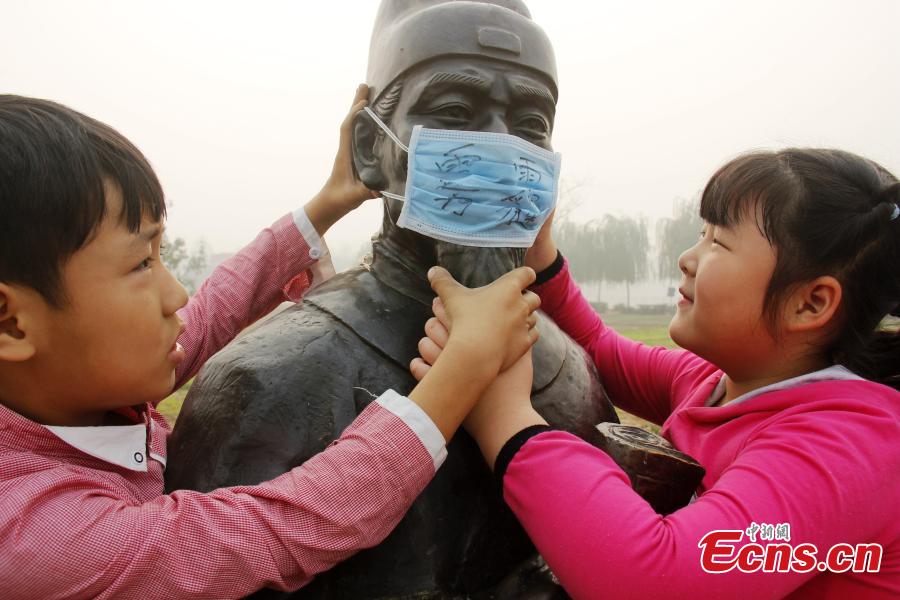 | Children put mask on a sculpture to ‘protect’ it from smog during an environmental awareness campaign at their school in Guangping county, North China’s Hebei province on Friday, October 10, 2014. Widespread smog has affected a large swath of north China as well as northwest China's Shaanxi province since Wednesday, with air conditions in northern Chinese cities including Beijing and Tianjin severely downgraded. [Photo: China News Service/ Cheng Xuehu] |