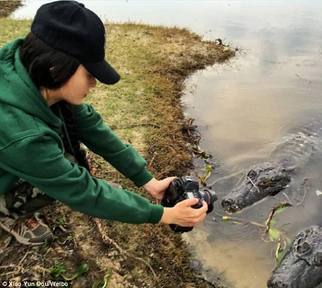Photographs show her holding a camera just centimetres away from the face of two deadly crocodiles - more than capable of ending her life.