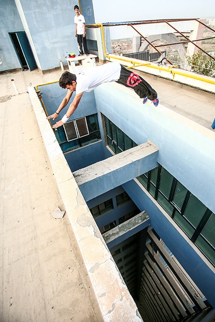 Kaysarjan practices parkour on Sept. 27, 2014. (Xinhua/Wu Zhuang)