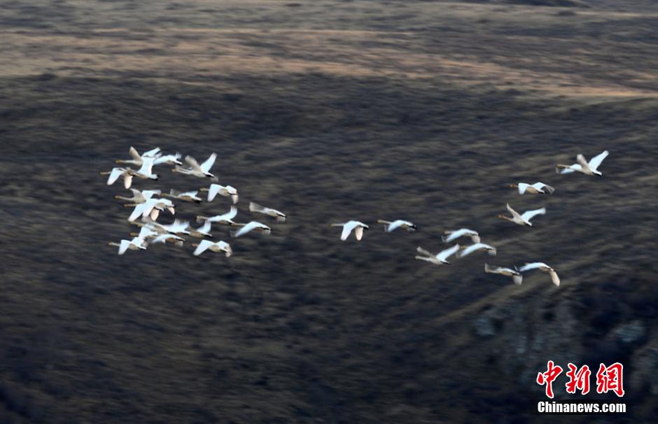 Rows of swans fly over the mountain area of Xinjiang. Swans began to fly away from Xinjiang as it gets colder in October. (Chinanews.com/Hu Re)