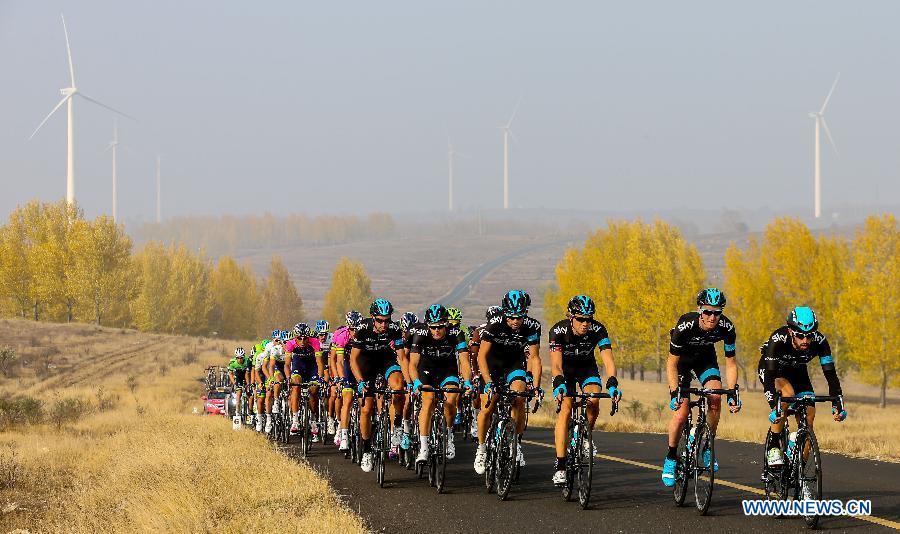 Cyclers compete during the first stage from Chongli to Zhangjiakou in north China's Hebei province on the tour of the Beijing cycling tournament, Oct 10, 2014. (Xinhua/Zhang Yu)