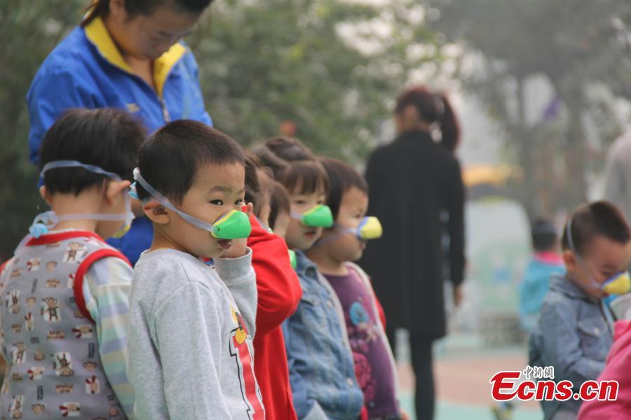 A teacher helps children wear anti-smog nasal air filters at a kindergarten in Beijing on Saturday, Oct 11, 2014. The municipal government raised its air pollution alert to orange, the second highest level on Thursday, after a wave of intense smog continued to blanket the Chinese capital. (Photo: China News Service/Liao Pan)