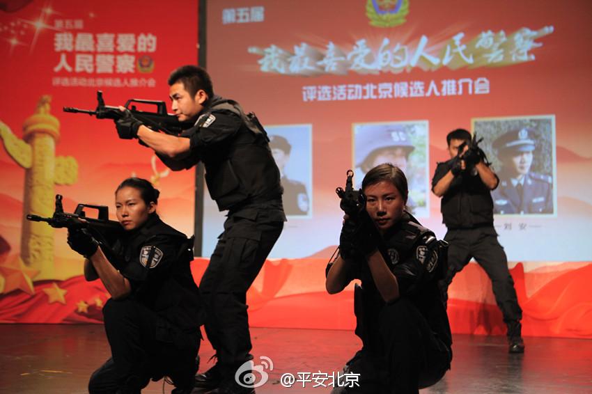 Cao Zhigang, a candidate for the fifth "My favorite people's police officer" came to Beijing Film Academy on Oct. 9, 2014. Cao and his colleagues told college students their own crime-fighting stories, and performed a cool posing gun show.