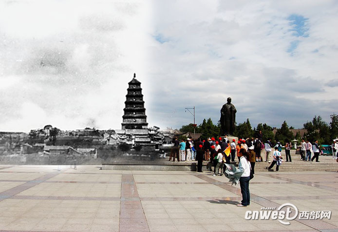 Giant Wild Goose Pagoda at present and in the past. The south square of the pagoda is in front of Daci'en Temple. It opened to public in 2001 after the construction work came to an end. A sculpture of Xuanzang stands on the square. (Cnwest/Li Gaofeng)