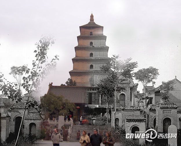 Giant Wild Goose Pagoda at present and in the past. The original pagoda was built during the reign of Emperor Gaozong of Tang in 652 to store images of Buddha and sutras taken back from ancient India by Xuanzang, a Chinese Buddhist monk. The pagoda is the largest brick tower dating back in Tang Dynasty. (Cnwest/Li Gaofeng)