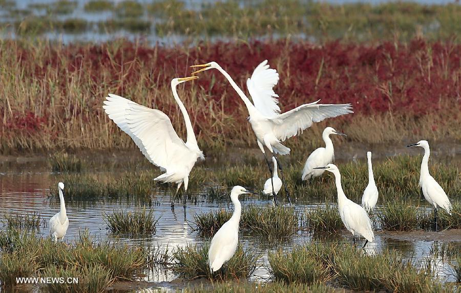 Egrets are seen on a wetland of the port city Qinhuangdao in north China's Hebei Province, Oct. 11, 2014. Thanks to the environment protection, the wetland has become a habitat to rest for over 10 million migrating birds yearly. (Xinhua/Yang Shiyao)