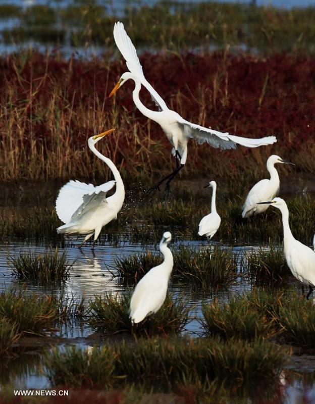 Egrets are seen on a wetland of the port city Qinhuangdao in north China's Hebei Province, Oct. 11, 2014. Thanks to the environment protection, the wetland has become a habitat to rest for over 10 million migrating birds yearly. (Xinhua/Yang Shiyao)