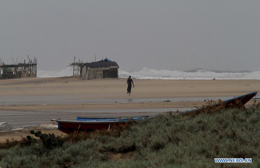 | A villager walks through strong winds at the Bay of Bengal coast in Gopalpur, east India's state of Orissa, on Oct. 12, 2014. At least six people were killed Sunday when severe cyclone "Hudhud" hit the east coast of India with winds of almost 200 kmph, said officials. (Xinhua/Stringer) |