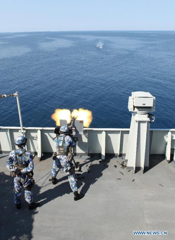 Soldiers of Chinese People's Liberation Army Navy take part in a shoot training on Changbaishan warship, October 11, 2014. Changbaishan warship is part of the 18th batch of convoy fleet sent by the Chinese People's Liberation Army Navy for escort missions in the Gulf of Aden. (Xinhua/Zhang Yuelin)