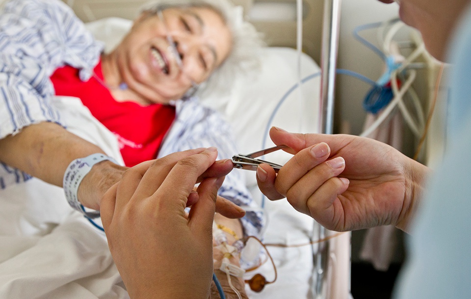 Every day, Wang patiently puts patients on a drip, changes dressing, cut nails and changes sheets for patients. (CNTV/Wang Zhe)