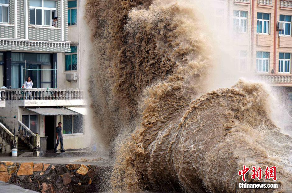 Photo shows high waves in Shitang Township, Wenling, east China's Zhejiang Province, Oct. 12, 2014. Affected by the powerful typhoon Vongfong, high waves were seen off the coast of provinces like Zhejiang and Fujian. (Photo/CNS)