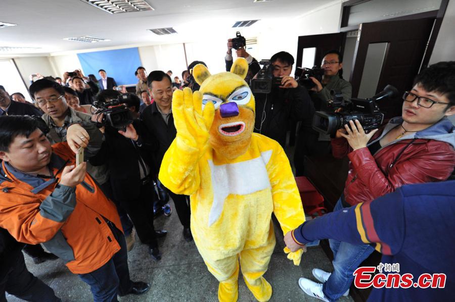 An unidentified lottery winner comes forward to claim his gigantic Dual-colored Ball jackpot at a welfare lottery issuing center in Taiyuan, Shanxi province on Monday, October 13, 2014. [Photo: China News Service/ Wei Liang]