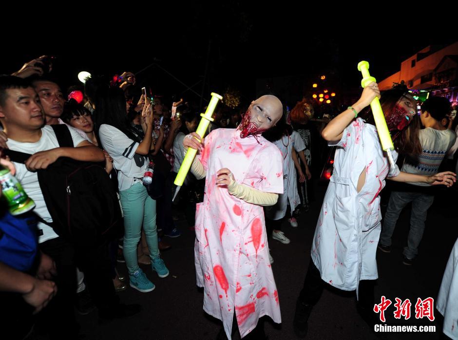 Performers dressed up as zombies, ghost brides, traditional Chinese monsters Heibai Wuchang and vampires come out at the 3rd "Halloween Festival" at Happy Valley in Wuhan, central China's Hubei province on the night of Oct. 11, 2014. (CNS/Zhang Chang)