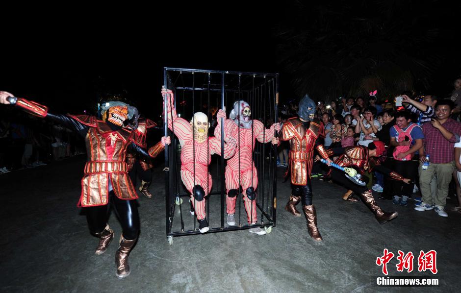 Performers dressed up as zombies, ghost brides, traditional Chinese monsters Heibai Wuchang and vampires come out at the 3rd "Halloween Festival" at Happy Valley in Wuhan, central China's Hubei province on the night of Oct. 11, 2014. (CNS/Zhang Chang)