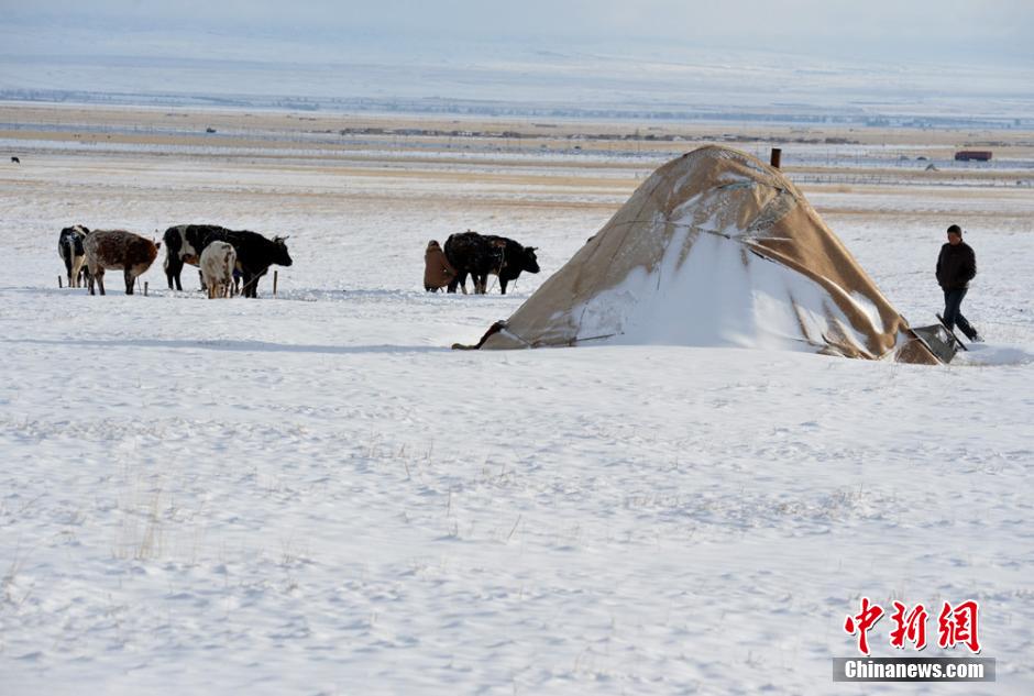 Heavy snow hit Balikun county in east Xinjiang from the evening of October 9 to the dawn of October 10. The sky became clear after snow and the lowest temperature reached minus 9 degrees Celsius. (Chinanews.com/Zhang Guojun)