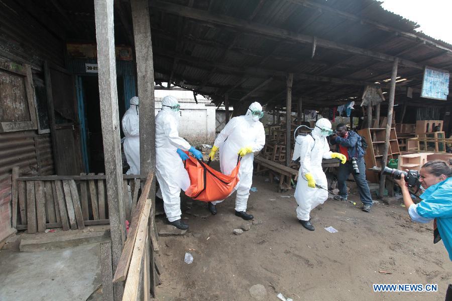Health workers retrieve a body infected with Ebola virus from a residential area in Monrovia, capital of Liberia on Oct. 14, 2014. (Xinhua/Marcus DiPaola)