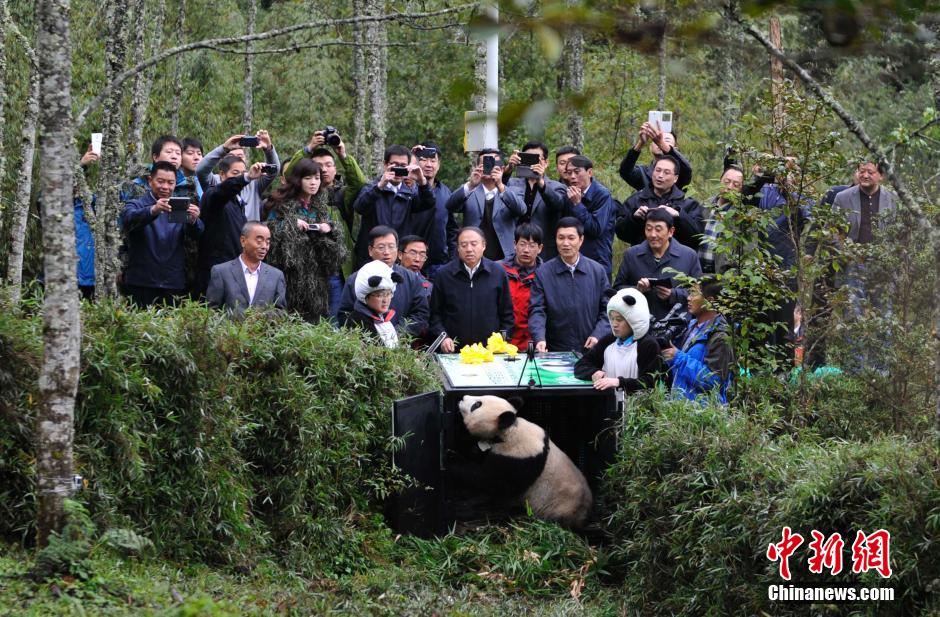 Xuexue, a 26-month-old panda, was released into the wild in Liziping National Nature Reserve, southwest China's Sichuan Province on Oct. 14, 2014.
