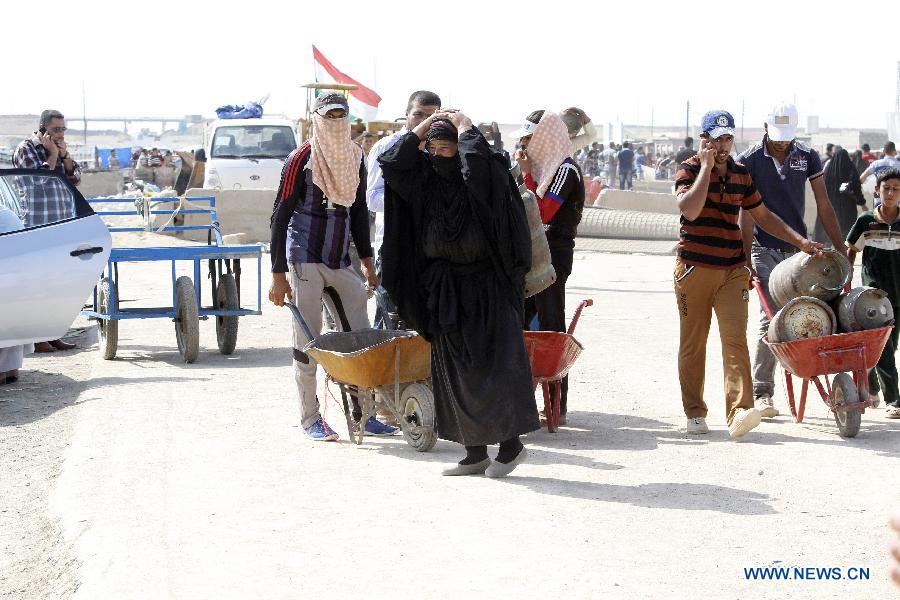Citizens walk past the only crossing between Hawija and the city of Kirkuk, northern Iraq, on Oct. 15, 2014. Hawija is about 20km southwest of Kirkuk which is controlled by the Islamic state (IS). (Xinhua/Dena Assad)