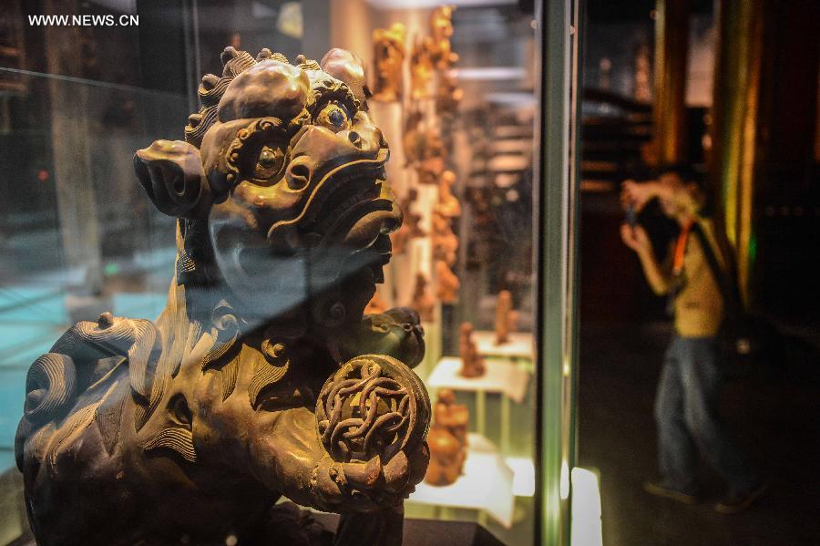 A visitor takes photos at the China Woodcarving Museum in Dongyang City, east China's Zhejiang Province, Oct. 16, 2014. The museum will officially open to the public on Oct. 18. (Xinhua/Xu Yu)
