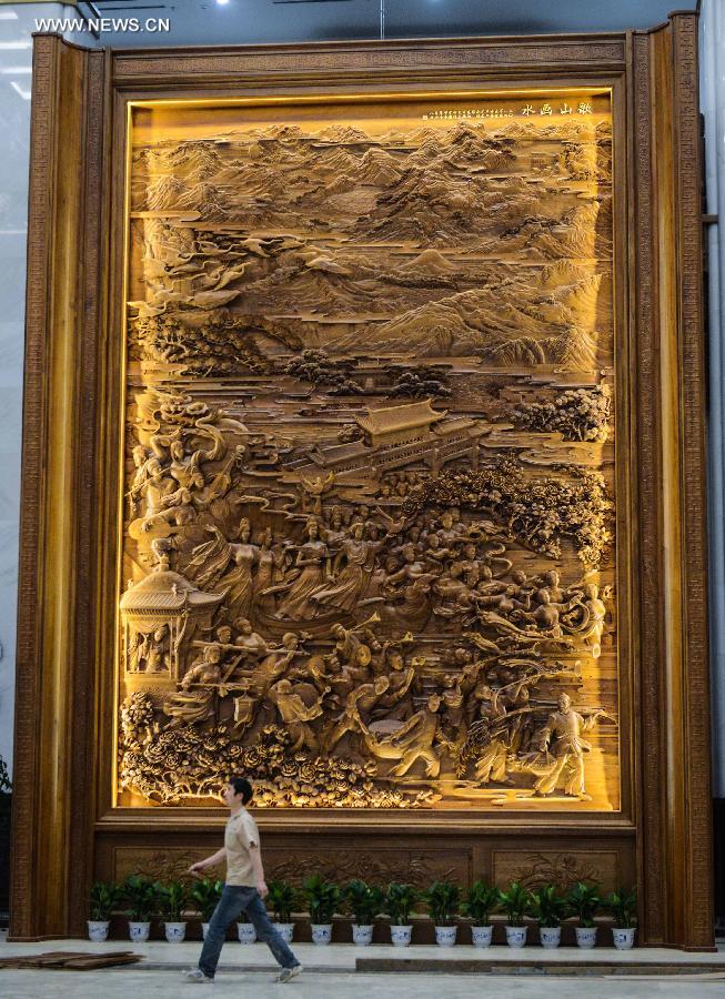 A man passes by a giant woodcarving displayed at the China Woodcarving Museum in Dongyang City, east China's Zhejiang Province, Oct. 16, 2014. The museum will officially open to the public on Oct. 18. (Xinhua/Xu Yu)