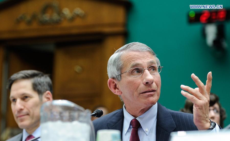 | Anthony Fauci, director of the National Institute of Allergy and Infectious Diseases, part of the National Institutes of Health (NIH) testifies during a hearing on Examining the U.S. Public Health Response to the Ebola Outbreak before the Oversight and Investigations Subcommittee at Capitol Hill in Washington D.C., capital of the United States, Oct. 16, 2014. A hospital in Texas where an Ebola patient died and two nurses were infected apologized Thursday for mishandling the deadly disease, as the National Institutes of Health (NIH) prepared to treat the first nurse who contracted the virus while caring for the deceased. (Xinhua/Bao Dandan) |